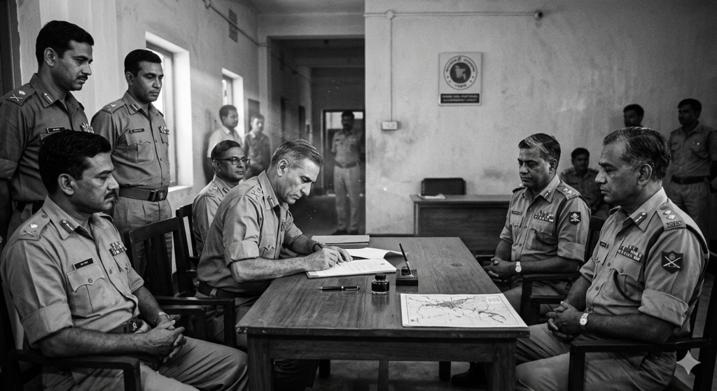 India officially entered on December 3, 1971. The formal war lasted just 13 days. On December 16, Pakistani General A.A.K. Niazi signed the Instrument of Surrender in Dhaka — 93,000 Pakistani troops surrendered, the largest military capitulation since World War II. Bangladesh was born as an independent nation.